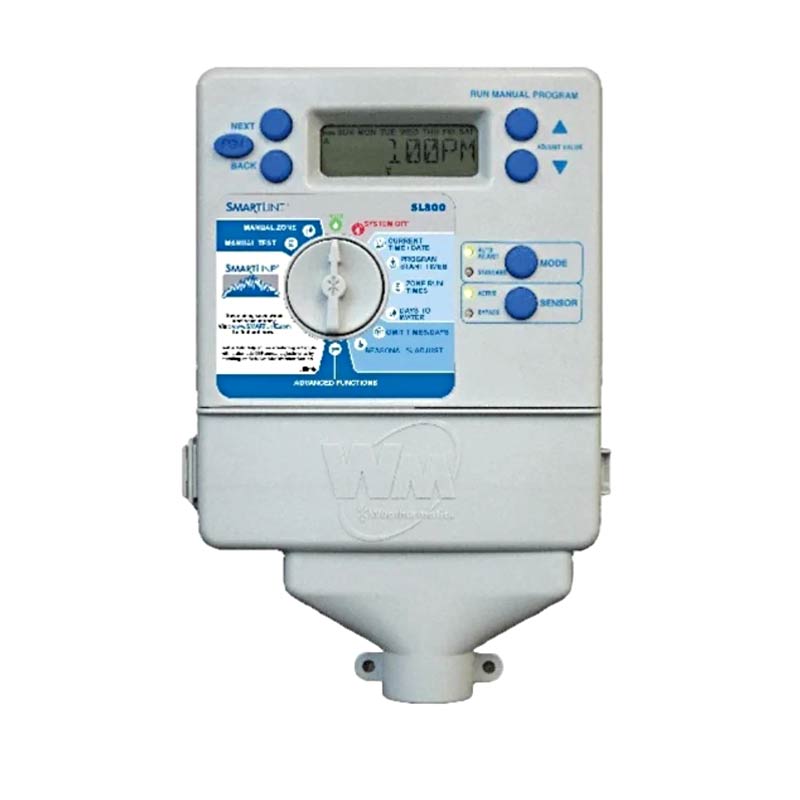 Weathermatic PL800 (ProLine) — это универсальный контроллер для автоматического полива, предназначенный для 4 зон (с возможностью расширения до 8), пригодный для установки как в помещениях, так и на улице. Оснащён крупным подсвеченным ЖК‑дисплеем и кнопками управления, поддерживает пять языков интерфейса и позволяет устанавливать время полива от 1 минуты до 9 часов 55 минут.
